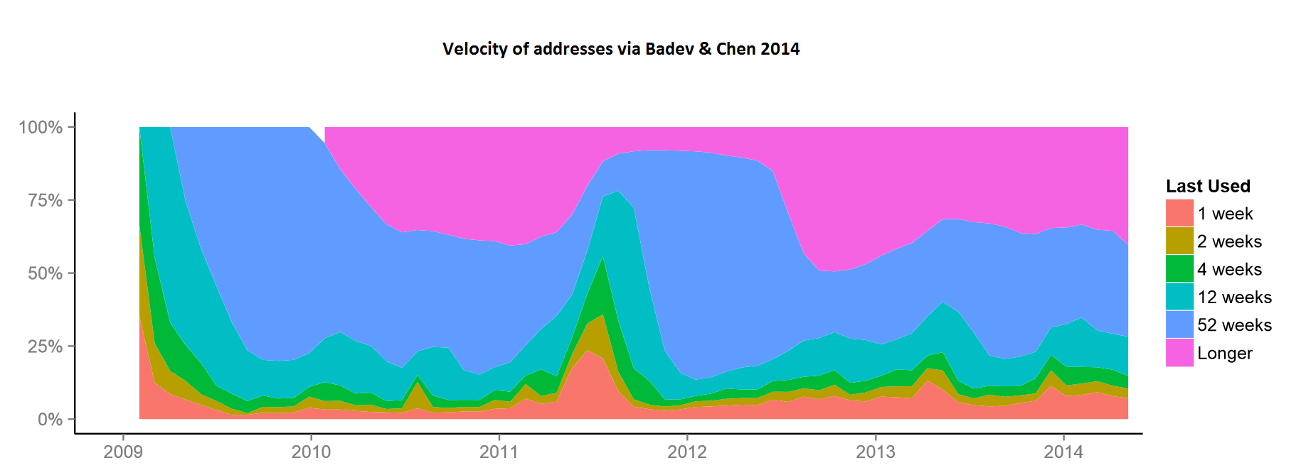 Future analysis should also look to factor in or filter out activity related to “change” addresses. For instance, the short-term ‘velocity’ seen in the daily and weekly bands of Ratcliff and Badev & Chen’s charts could be overstated due to coins which do not actually swap hands but are rather “spent” to themselves due to how “change” is handled by the protocol. Furthermore, as has been described in Dave Hudson’s modeling of block sizes, it cannot be said that an increase in on-chain volume is axiomatically “good.”49