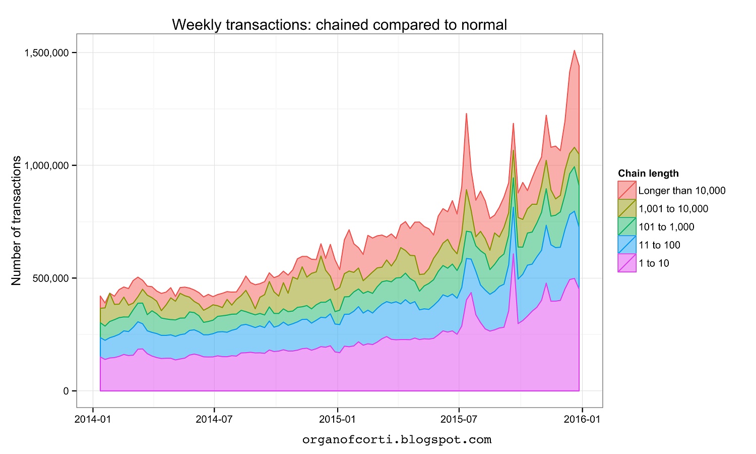This is roughly twice as many on-chain users as twenty-one months ago (in April 2014) — at block height 295,000 — when I first started looking at this source.1