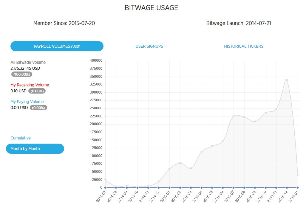 The two charts above both come from Bitwage, a startup that converts payrolls into bitcoins. Ignoring the drop-off in January 2016 (it is the beginning of a new month), for most of 2015 there were roughly 200-300 new user signups each month and about $250,000 in salaries converted as well.