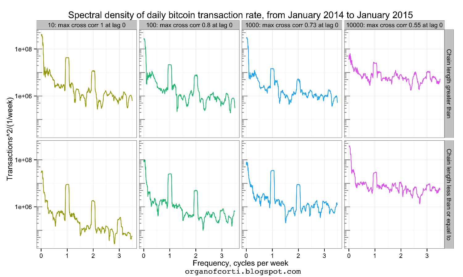 The last plot shows the spectrograms for chains longer and shorter than 10, 100, 1000, or 10000. These show a periodicity similar to that for all transactions of one cycle per week.