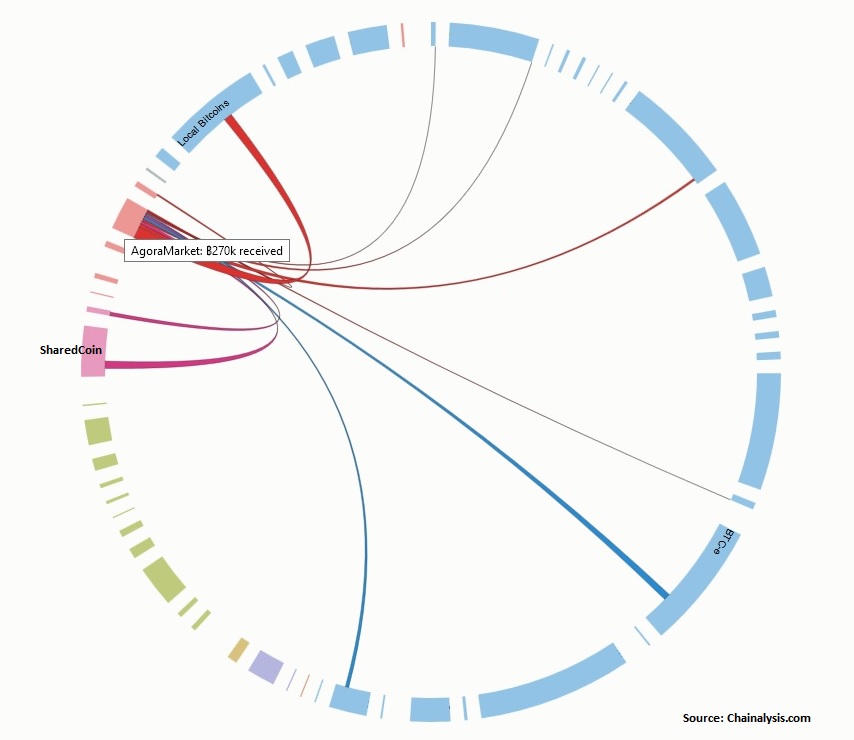 Founded in the spring of 2013, Agora (depicted in red above) was the largest known darknet market operating in 2015.